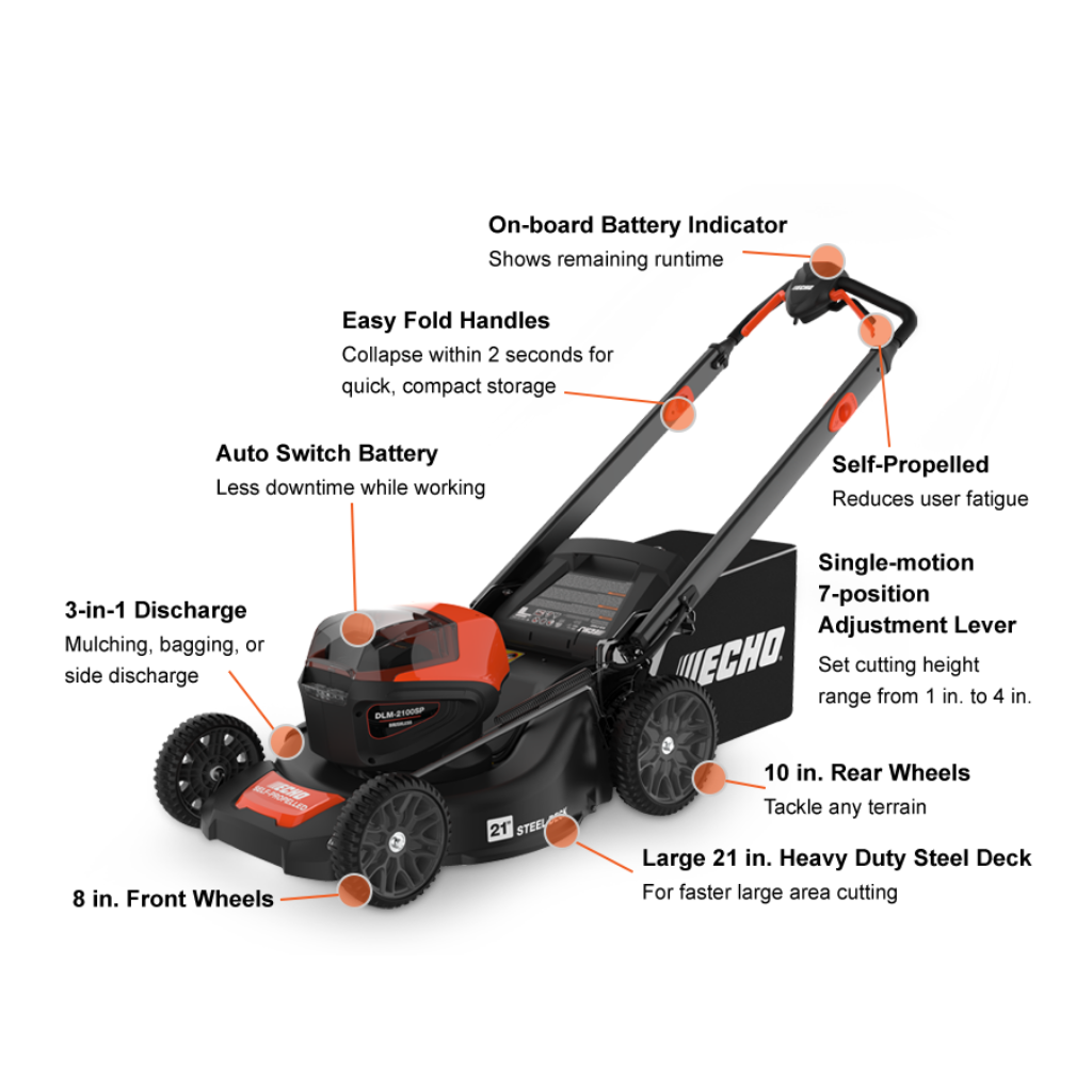he DLM-2100SP self-propelled mower, powered by the ECHO 56V Battery System, delivers hassle-free mowing with legendary ECHO power. With an auto-switch dual-battery dock, three quick-switch clippings discharge settings and a large 21-in. cutting deck, it makes cuts without compromise.