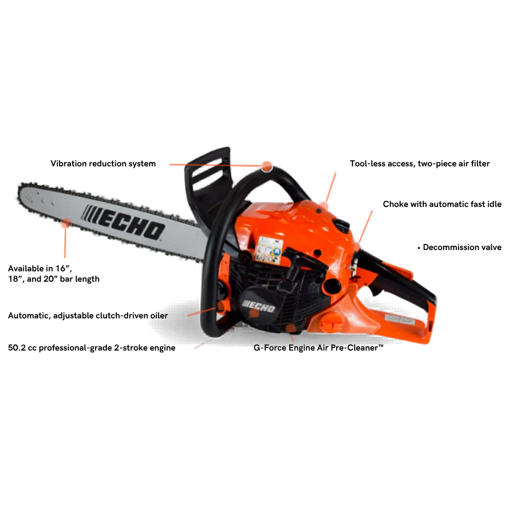 ECHO’s CS-4910 is and excellent mid-sized saw that boast great features like a 50.2 cc professional-grade 2-stroke engine, a high-grade crankcase for durability and the lightest weight in it’s class. This versatile saw is great for diverse applications, like trimming limbs, felling trees or storm clean up.