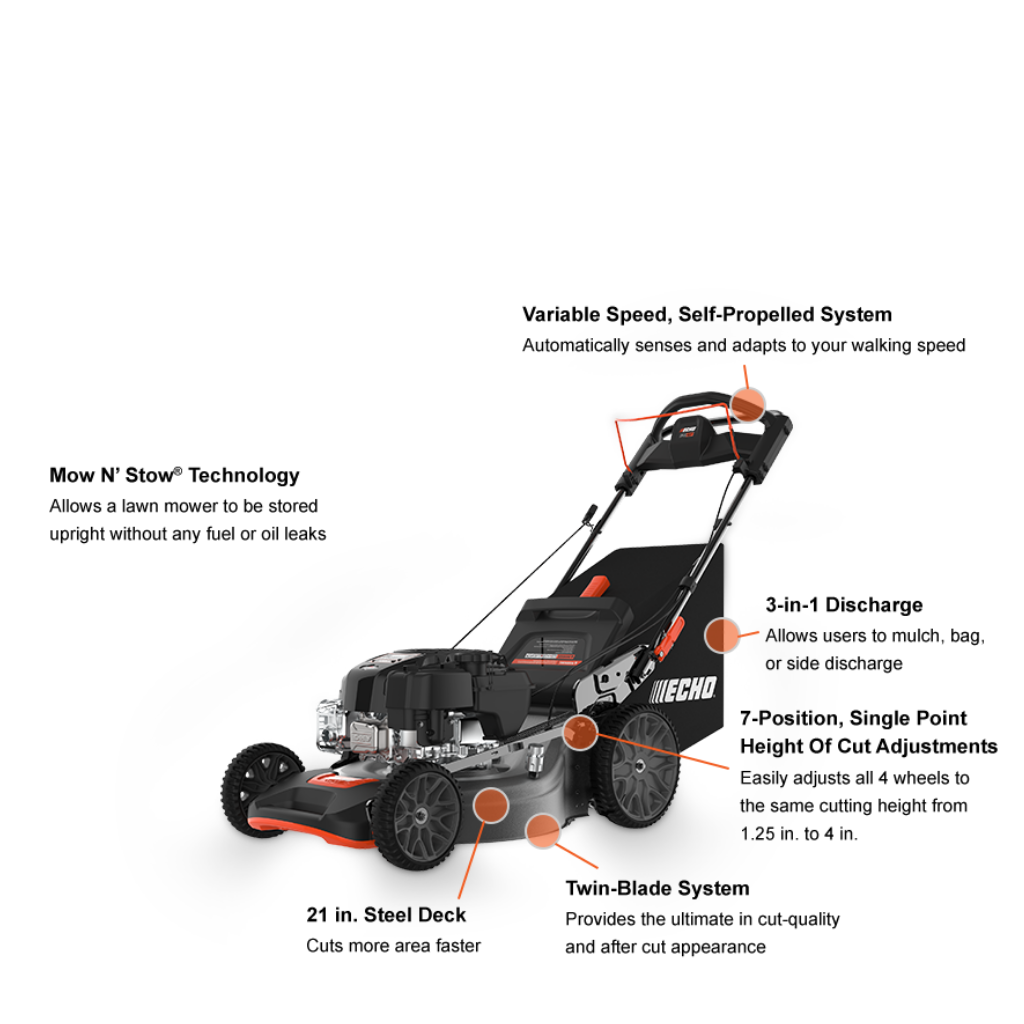The ECHO LM-2119SP Self-Propelled Mower, designed for up to an acre, features a 190 cc Briggs & Stratton® engine, variable-speed self-propelled system, and Mow N’ Stow® for easy storage. It offers a 3-in-1 cutting system, dual blades, and adjustable mowing height for excellent performance on various terrains.