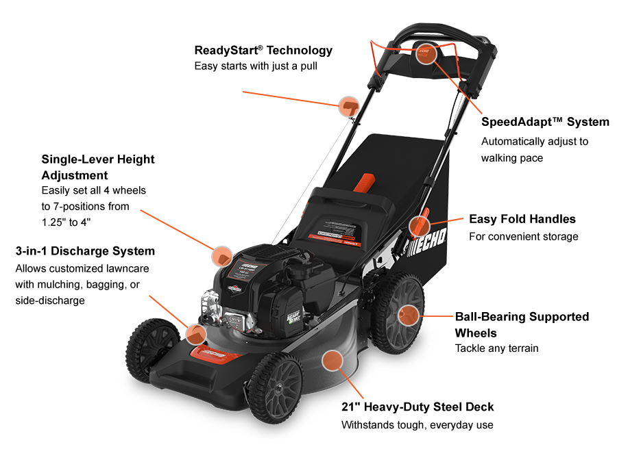 The ECHO LM-2116SP 163cc, 21″ self-propelled lawn mower offers 3-in-1 mulching, bagging, and side discharge. Its Briggs & Stratton ReadyStart® engine ensures easy starts, while the variable speed, ball-bearing wheels, and single-point height adjustment from 1.25 in. – 4.0 in. provide smooth, customizable mowing.